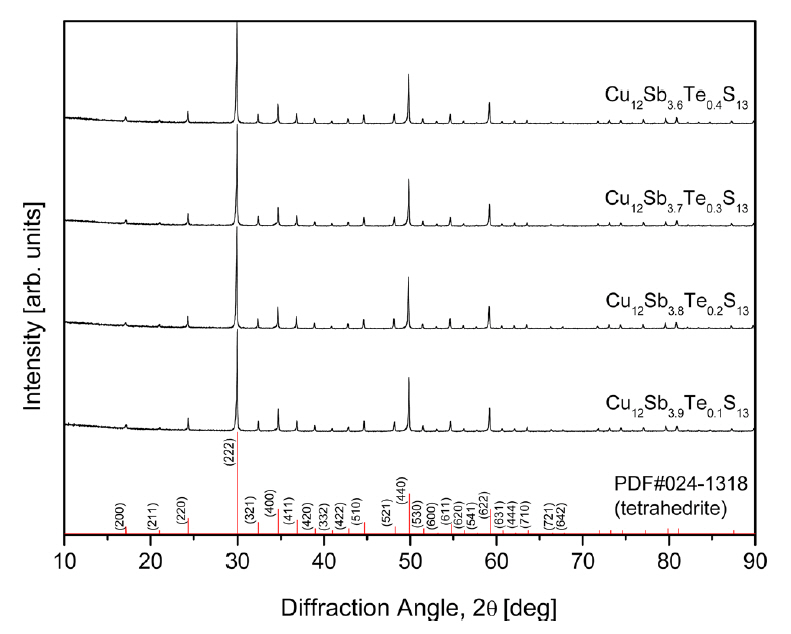 XRD patterns of the Cu12Sb4-yTeyS13 prepared by the MA-HP process are shown in Figure 1. The diffraction peaks of all the specimens matched the ICDD standard diffraction