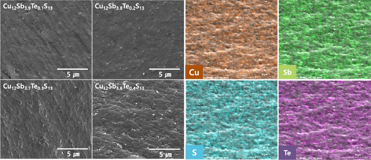 not observed. The EDS elemental maps of Cu12Sb3.6Te0.4S13 showed that the constituent elements were uniformly distributed. As shown in Table 1, the experimental composition agreed well with the nominal composition; however,