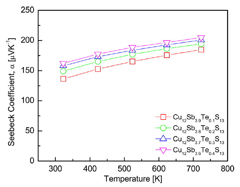 Figure 5 shows the Seebeck coefficients of the Cu12Sb4-yTeyS13 compounds. All of the specimens exhibited positive values for the p-type semiconductor
