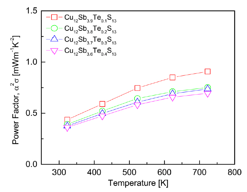 while the Seebeck coefficient increased due to reduced carrier concentration. Cu12Sb3.9Te0.1S13 exhibited the highest PF of 0.91 mWm-1K-2 at 723 K because the decrease in electrical conductivity dominated the increase in