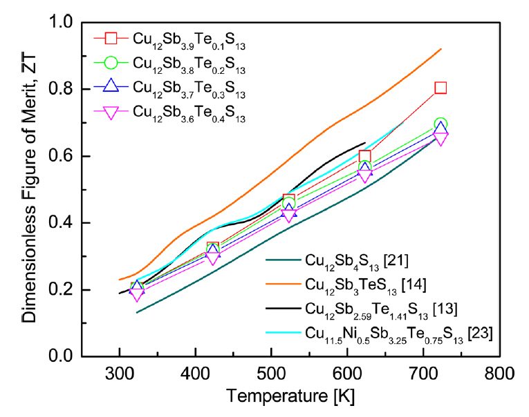 Figure 8 shows the ZT for Cu12Sb4-yTeyS13. ZT increased with temperature because of the temperature dependence of PF and thermal