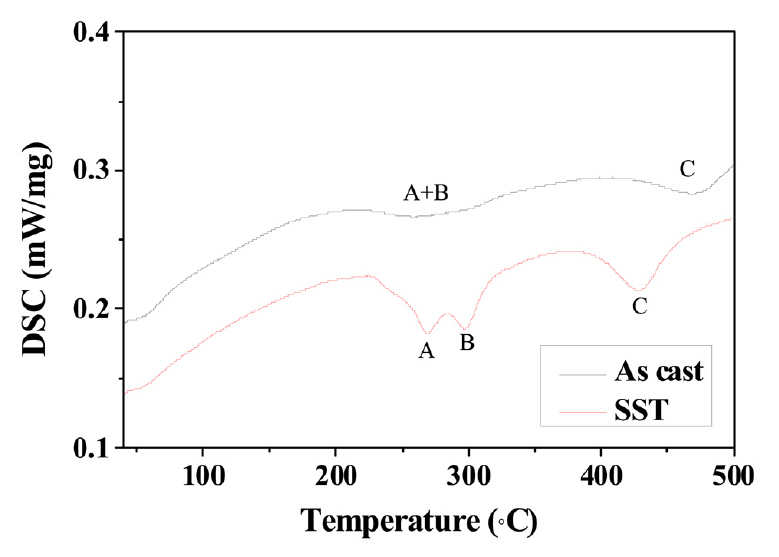 관찰되었다. 그 중 석출을 의미하는 발열 곡선에 대해 A, B, C로 명명하였다. 열 흐름 곡선은 금속재료가 가열될 때 발생하는 상의 석출과 용해
