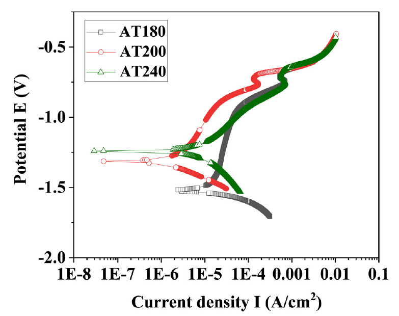 최대부식전류밀도 역시 시효 온도가 증가할수록 감소하여 합금의 내부식성이 증가하는 것을 알 수 있다. 부식속도는 AT180 시편이 3.79 MRY로