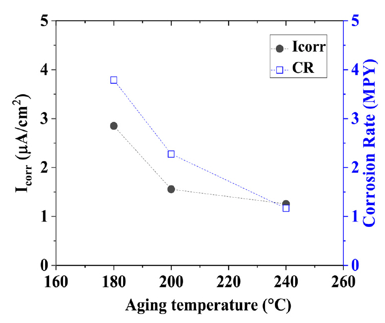 가장 높게 나타났다. 이를 통해 시효 온도의 증가와 그로 인한 석출물의 성장은 합금의 내부식성에 긍정적인 영향을 미치는 것으로 판단된다. 특히, 그
