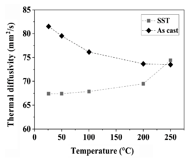 한편, 분석 온도 상승에 따라 두 시편의 열확산도는 서로 다른 경향으로 변화한다. 주조 시편의 열확산도는 온도 증가에 따라 감소하나, 용체화 시편의