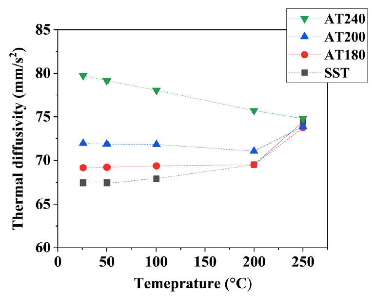 온도 별 시효 처리에 따른 Al-1.9Mg2Si 합금의 열확산도를 측정한 결과는 그림 8과 같다. AT180 시편의 상온 열확산도는 69.1 mm/s2로 용체화 시편에 비해 약 1.7 mm/s2 증가하였다. 시효 온도가 높아질수록 열확산도 증가 폭도 증가하여, AT200 시편의 상온 열확산도는 79.7 mm/s2로 용체화 시편에 비해 10 mm/s2 이상 높은 열확산도는 갖는다. AT240 시편은 열 흐름 곡선에서 Mg2Si상의 석출이 대부분 완료된 상태로 확인되었으며 상온에서 높은 열확산도를 가진다. 그러나 분석 온도가 증가하면서 AT240 시편의 열확산도는 하락하는