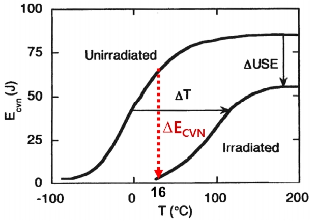 이 거동은 그림 1[7]에 간략히 나타내다. 왼쪽의 Unirradiated 곡선은 S자를 오른쪽으로 기울여 놓은 것과 유사하다. 고속중성자 조사에 의하여 RPV 재료는