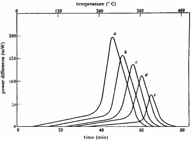 여기서 T1 및 T2는 열분석 중 시험편의 가열 속도가 각각 α1 및 α2 일 때의 발열 반응의 온도이다.