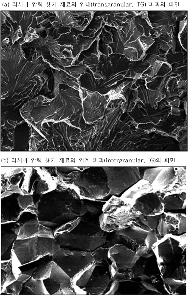 그림 2에는 러시아 압력 용기 재료에서 확인된 입내 파괴와 입계 파괴 파면을 나타내었다 [7]. 그림 2의 (a)는 입내 파괴를, (b)는 입계 파괴를 각각 나타내고 있다. 최근, 이 입계 파괴 시편에 대한 분석은 결정 입계에 인(P)의 편석 [8], 탄화물의 석출 [9,10], MnNi rich 상 석출[5] 등을 확인하였으며, 이것 때문에 입계 파괴가 일어나는 것이라고 보고하고 있다. 이들 연구는 미세조직 차이를 분석한 것이지만, 이런 기존의 패러다임은
