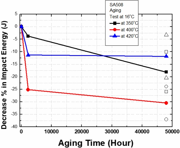 350 °C에서 2,250H 및 48kH 열적 처리는 각각 4% 및 18%의 파괴인성을 감소시킨다. 400 °C에서 2,250H 및 48kH 열적
