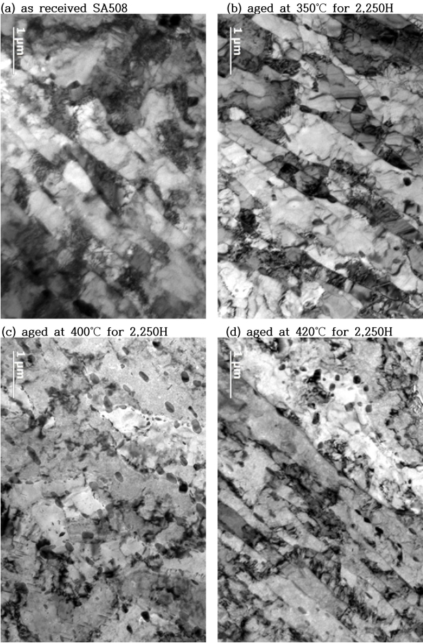 Comparison of TEM micrographs in as received and aged SA508 at 350-420 °C for 2,250H,