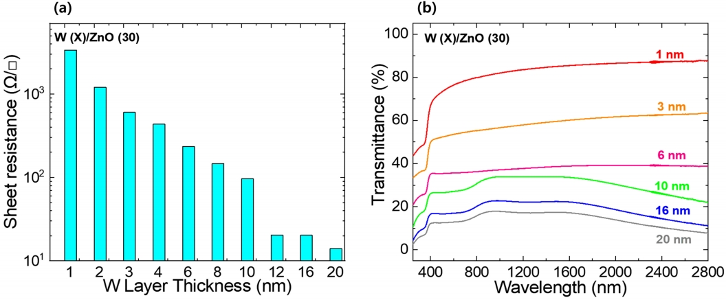광학적, 전기적, 구조적 특성에 대하여 조사하였다. 대기에 노출 시 발생하는 W층의 산화를 방지하기 위해 상부에 30 nm 두께의 ZnO 산화물을