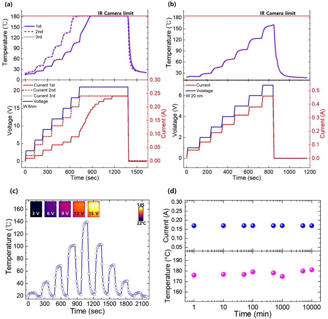 두께가 20 nm인 면상 발열체의 경우 (그림 4(b)) 온도가 160 °C에 도달할 때까지도 계단식의 전류/온도 증가 특성을 보였으며 특정 전압 인가 시 전류/온도의 변화는 관찰되지 않았다. 그림 4 (c)는 6 nm 두께의 W층으로 구성된 면상발열체의 저항 변화 이후 히팅 반복 테스트 결과이며, 전압의 인가와 중단을 반복할 때 매우 우수한 발열 재현성을