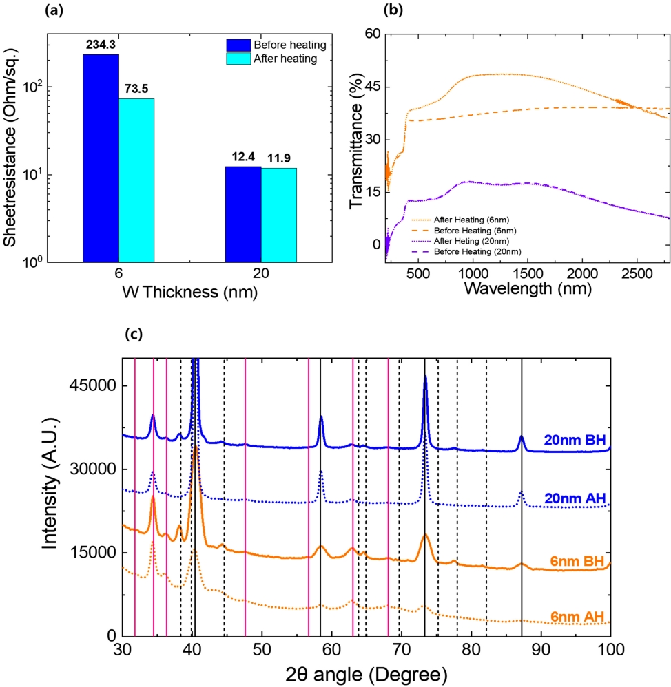 우수한 고온 안정성을 보여주었다. 이에 반해 20 nm 두께의 W층의 경우 발열 전후 미미한 수준의 면저항 저감이 발생하고 투과도의 경우 거의 변화가