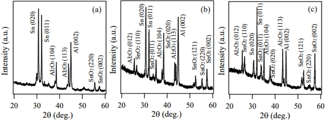 그림 1은 400 °C, 600 °C, 800 °C의 대기압 공기 분위기에서 1시간 동안 열처리한 시료의 XRD 패턴을 나타낸다. SnO2와 Al의 회절 피크 이외에 Sn과 Al2O3의 회절 피크가 관찰되었다. XRD 패턴을 분석하여 Al2O3는 육방정계 결정구조를 가진 α상 임을 알 수 있었다. 400 °C 온도에서 열처리한 시료에서도 높은 강도를 가진 Sn 회절 피크가 관찰되었다. 이와
