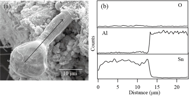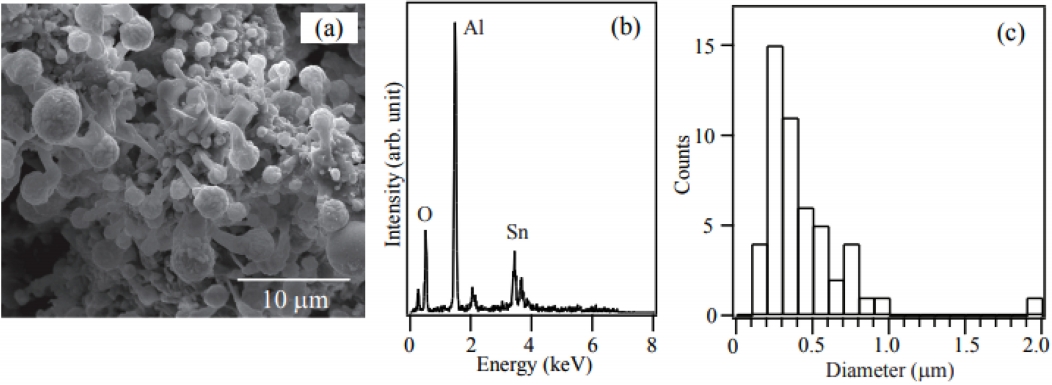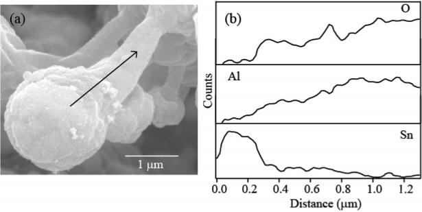 결정의 끝부분에서 형성된 구형 입자는 Sn으로만 구성되어 있으나 막대 결정 부분은 Al과 O로 구성되어 있었다. 분석 결과로부터 막대형상의 결정은