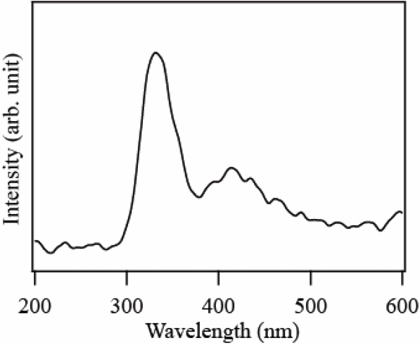 그림 7은 600 °C에서 열처리한 시료의 CL 스펙트럼을 나타낸다. 600 °C에서 열처리한 시료는 많은 Al2O3의 일차원 나노/마이크로구조로 구성되어 있었다. 330 nm에서 중심 파장을 가진 강한 강도의 발광 피크와 415 nm가 중심 파장인 약한 강도의