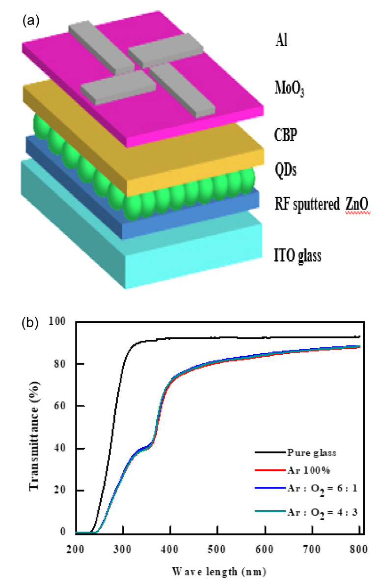 (a) A schematic diagram of QLEDs with a sputtered ZnO thin film and (b) transmittance