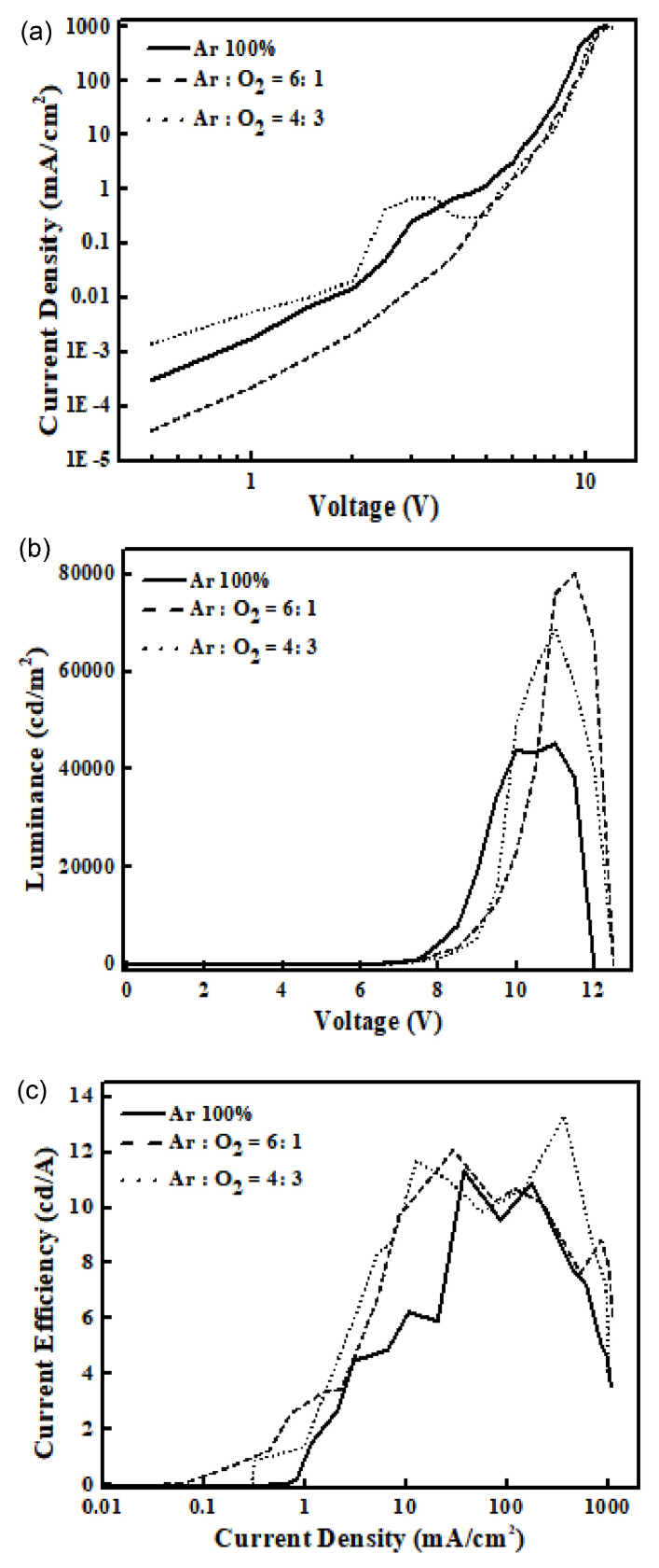 박막의 전류 밀도보다 낮은 전압 영역에서는 높은 값을 보이나 Turn-on 전압 이후에는 다소 낮은 값을 나타낸다. 아르곤과 산소의 비율이 4:3인