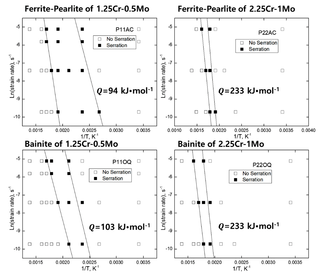 거동의 차이를 분석하였다. 시험 온도와 변형률 속도에서 serration 발생 여부를 그림 10에 나타내었고 serration이 발생하는 열적 활성화 에너지(Q)를 다음의 Arrhenius 식으로 계산하였다 [15].