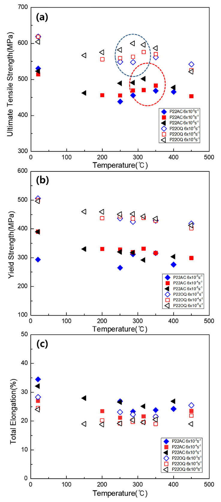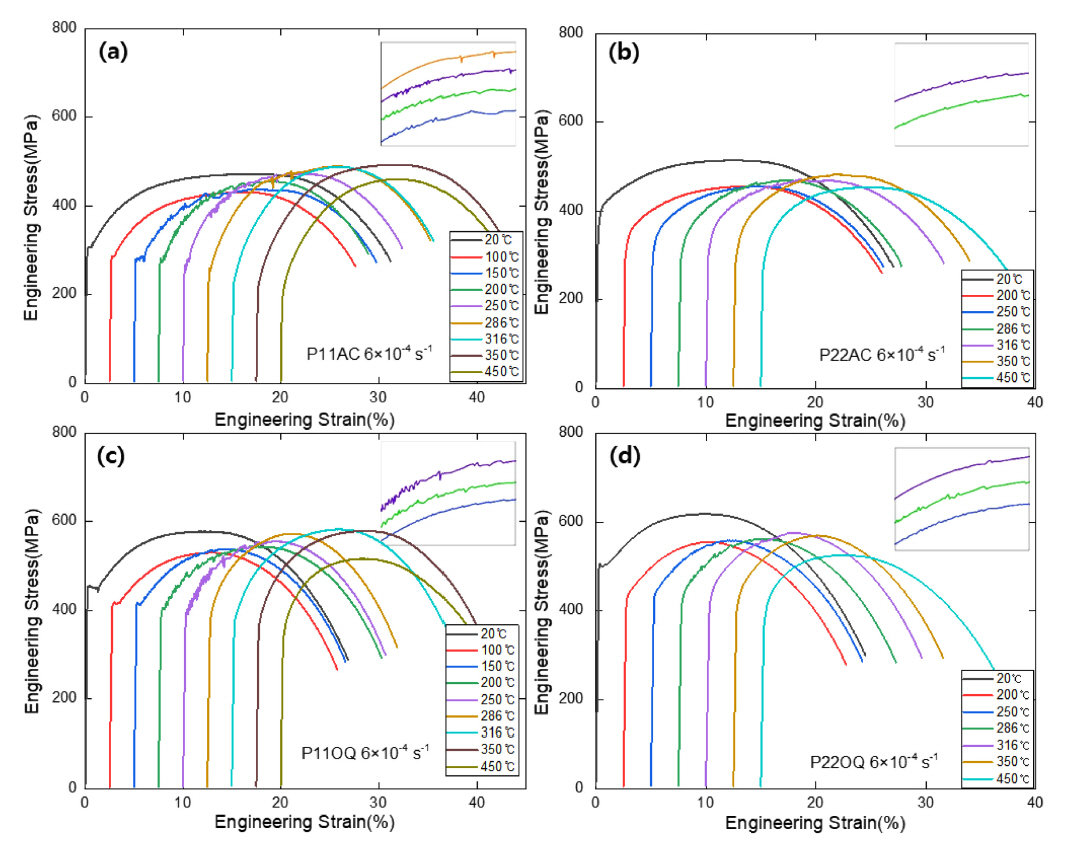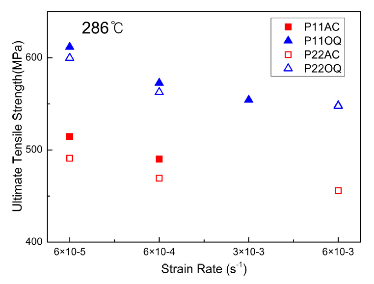 P22AC보다 크게 나타났다. Bainite 조직에서도 286~350 °C에서 P11OQ의 최대인장강도가 P22OQ 보다 크게 나타났다.