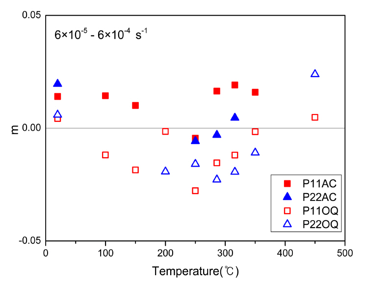 • 1.25Cr−0.5Mo (P11)강의 활성화에너지 값은 94~103 kJ/mol으로 침입형원소에 의한 전위이동 억제로 동적 변형시효가 발생하는