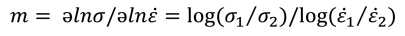 관계식 [13,14] 으로 진변형률 0.05에서의 응력으로 변형률 속도 민감도(m)를 계산하고 그림 9에 나타내었다.