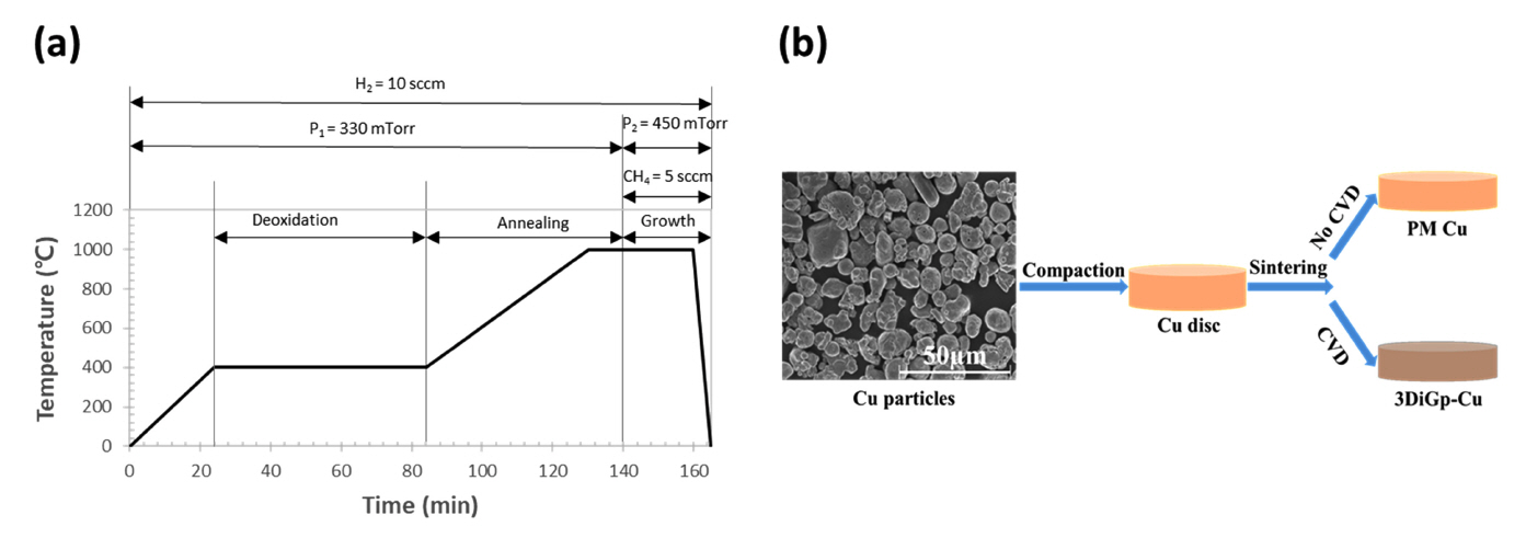 in Figure 1(a). The fabrication scheme to produce the 3Di Gr-Cu composite and PM Cu is shown in