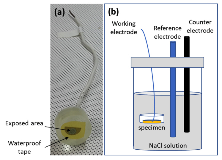 as the counter electrode as shown in Figure 2(b). Experiments were performed at 25 °C in 3.5 wt% NaCl solution, which was degassed