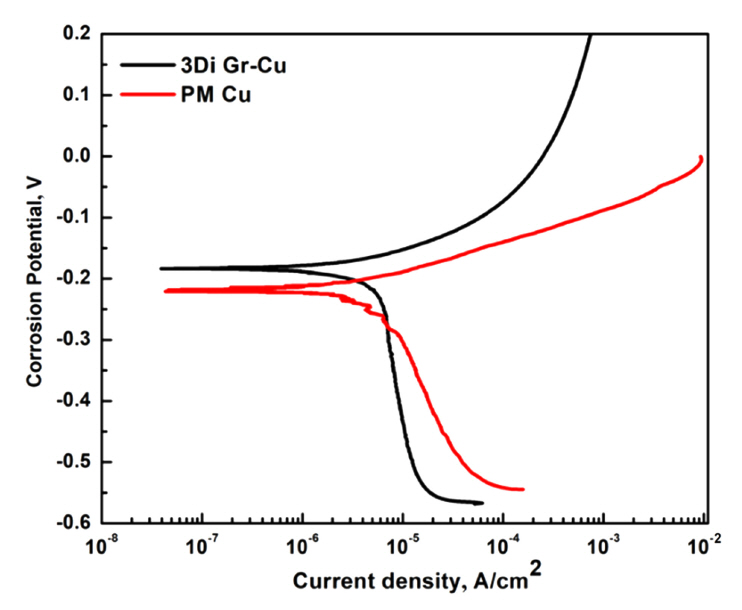 Potentiodynamic polarization curves of PM Cu and 3DiGr Cu composite in 3.5 wt% NaCl