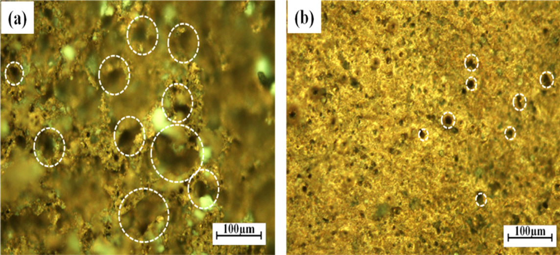 OM images of PM Cu (a) and 3Di Gr-Cu composite (b).