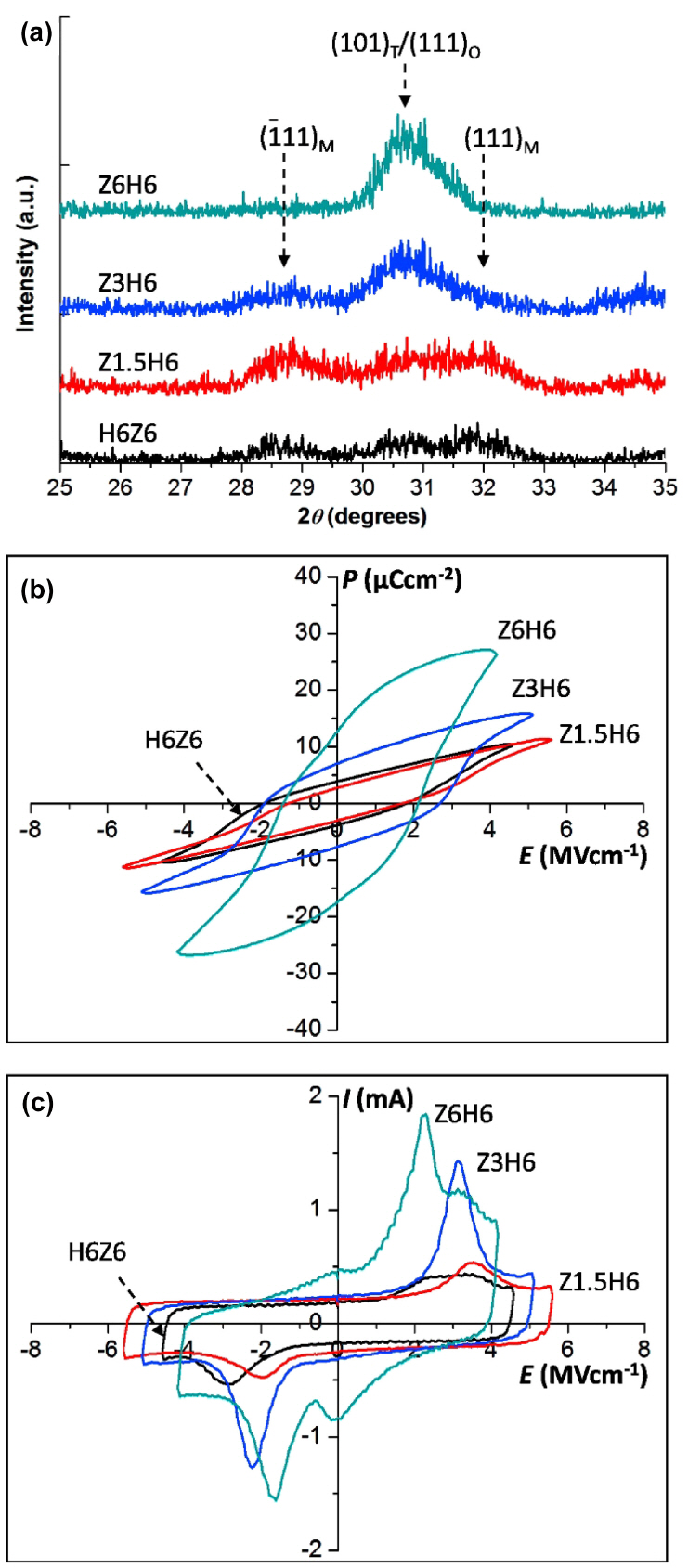 Analyses of ZrO2/HfO2 and HfO2/ZrO2 bilayer thin films: (a) GIXRD patterns, (b) P-E hysteresis curves and (c) I-E curves