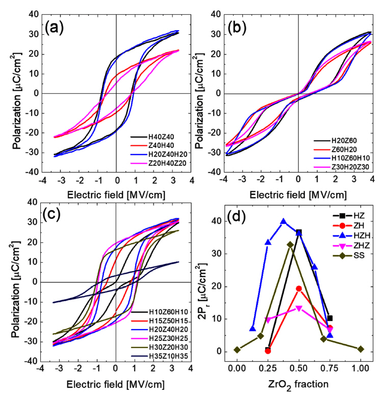HfO2:ZrO2 ALD cycle number ratios. (d) Change in 2Pr as a function of the ZrO2 fraction for HZ, ZH, HZH, and ZHZ samples as well as solid solution (SS) films. (Reproduced
