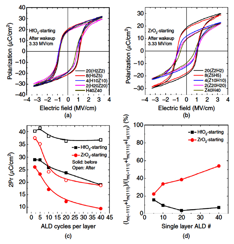 P-E curves of the (a) HfO2- and (b) ZrO2-startingnanolaminates. Changes in the (c) 2Pr and (d) (Im(-111)+Im(111))/(Im(-111)+Im(111)+Io(111)) as functions of the ALD cycle number per single layer for before wake-up