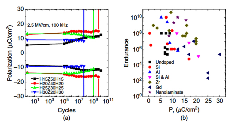(a) Endurance test results of the HZH samples with various HfO2:ZrO2 atomic layer deposition cycle ratio (30:50, 40:40. 50:30, and 60:20). The bipolar