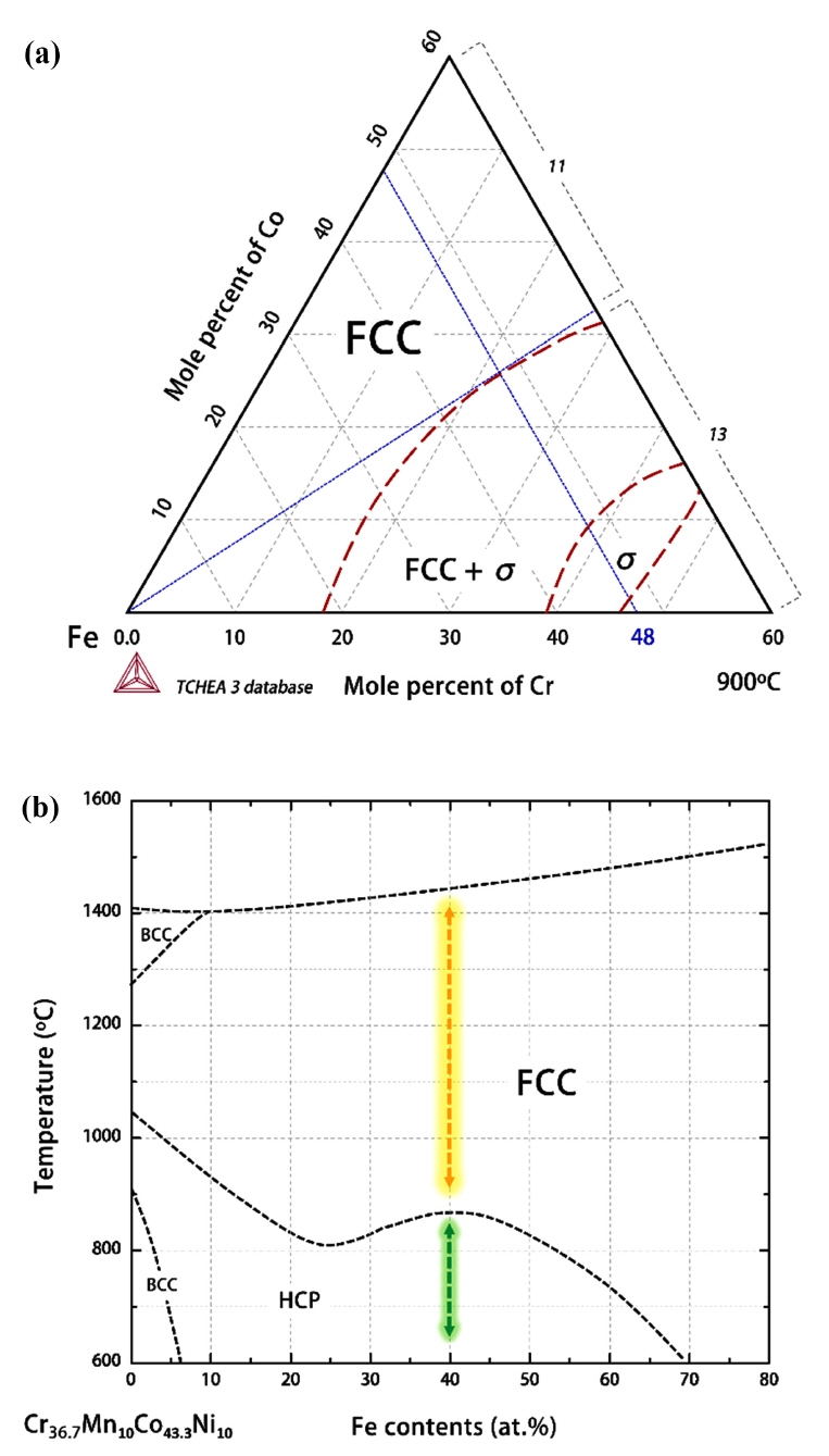 of Mn and Ni, respectively. (b) Pseudo-binary phase diagram of the system (Cr36.7Mn10Co43.3Ni10)-Fe.