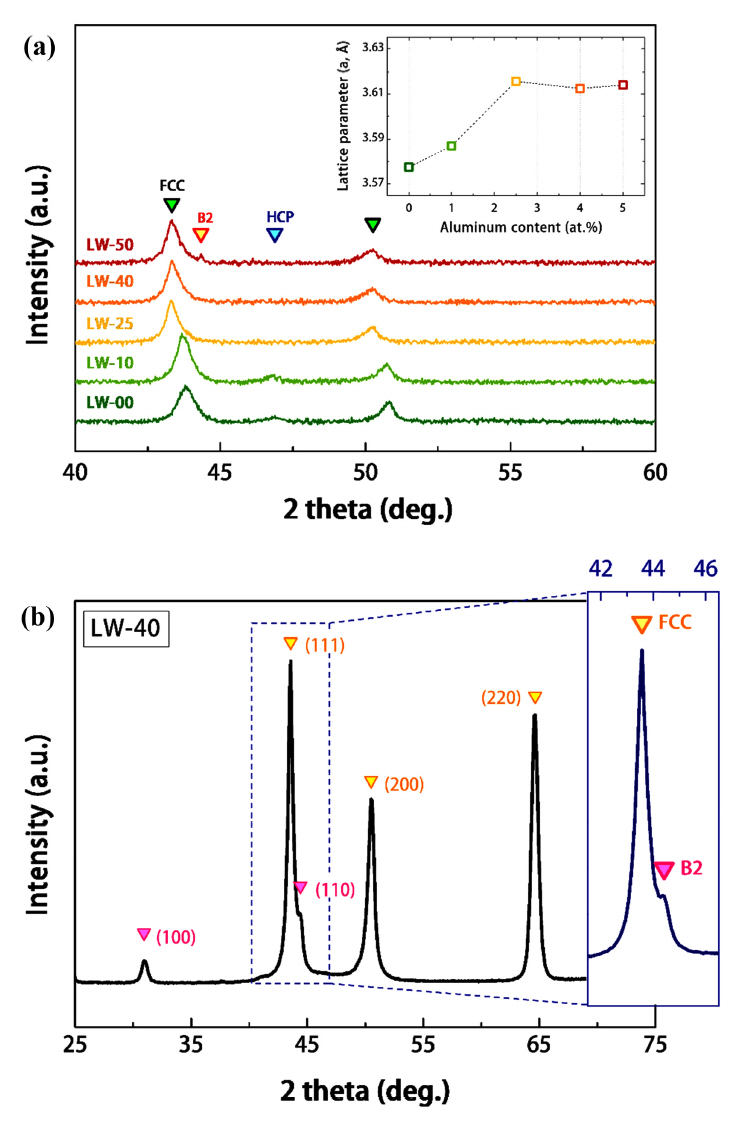 (a) XRD traces of LW-00, LW-10, LW-25, LW-40, and LW-50 HEAs. The inset shows the