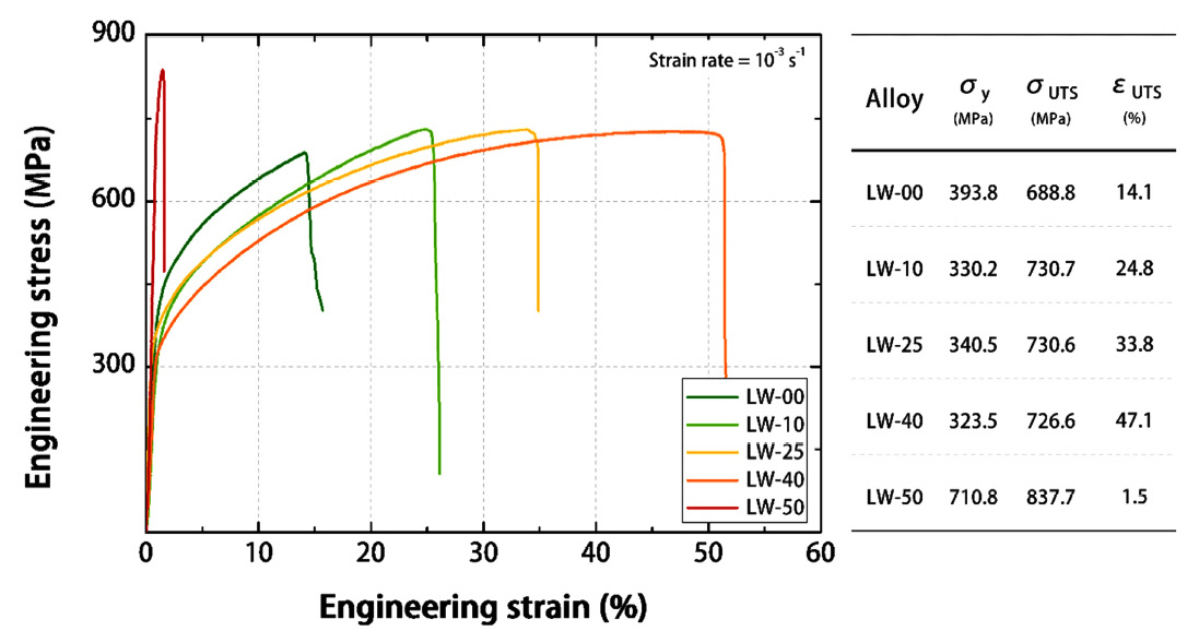 Engineering stress-strain curves of LW-XX HEAs. Inserted table summaries yield strength