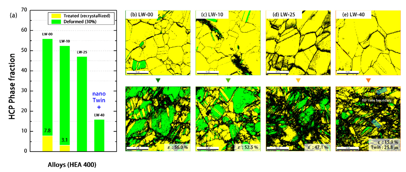 (a) Phase fraction of FCC and HCP phase and (b-e) EBSD maps showing the phase constitution