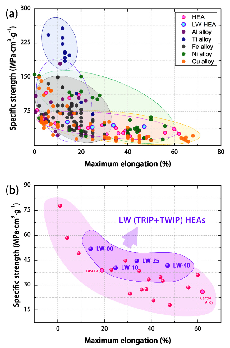 Relationship between specific strength and the maximum elongation in (a) various FCC