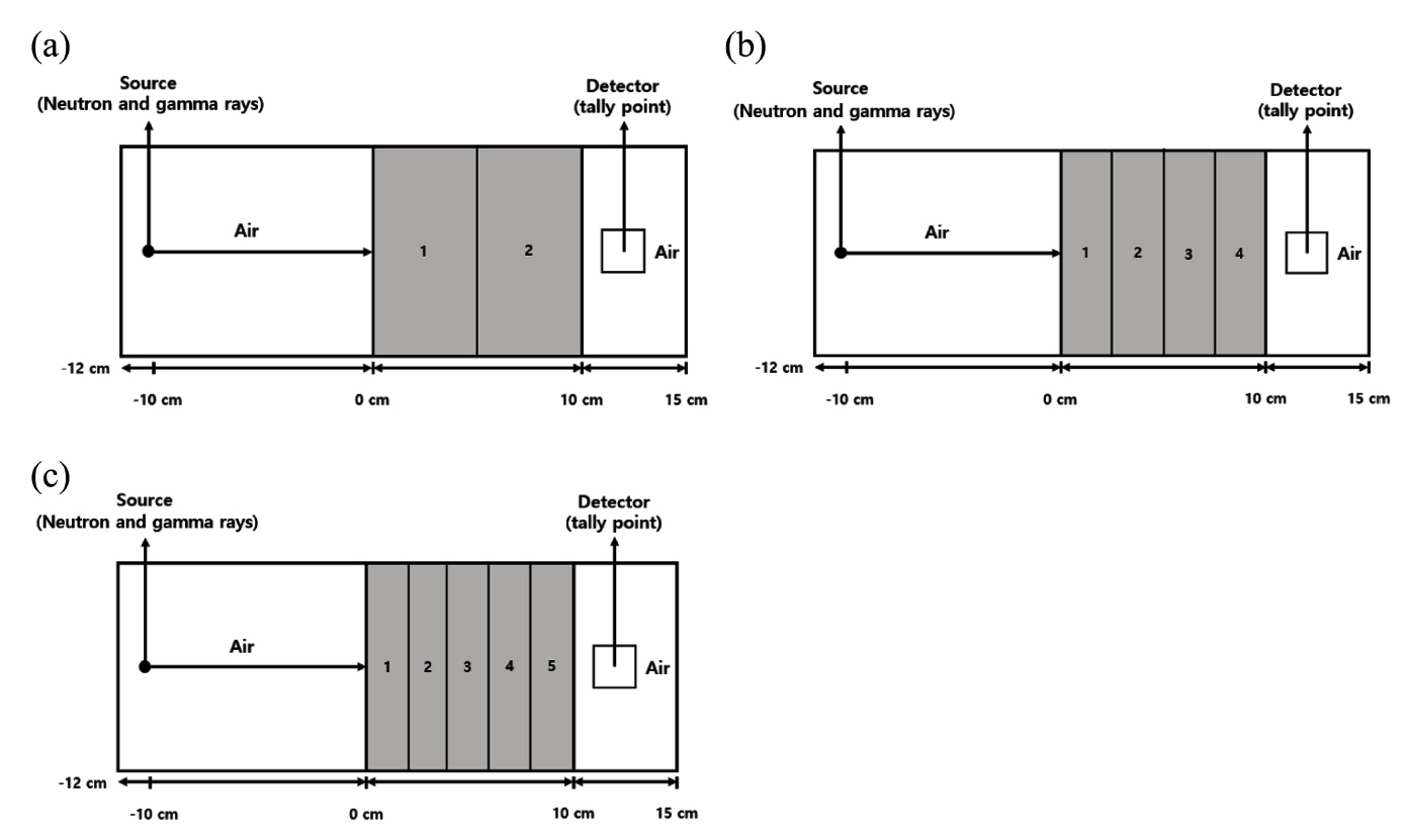 when the shielding material is irradiated. Figure 2(a-c) is a schematic of a multilayer shielding analysis model. Parts (a), (b), and (c)
