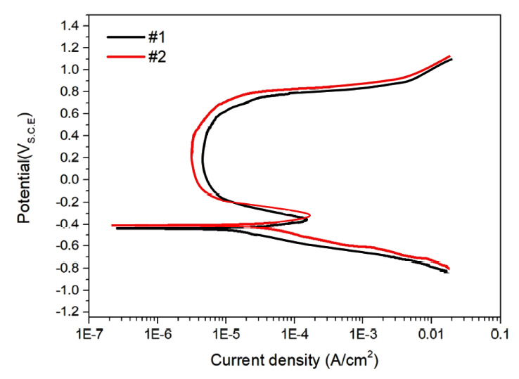 To compare the corrosion resistance caused by the delta-ferrite, we conducted potentiodynamic