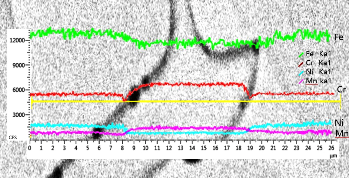 in the Cr content was observed at the delta-ferrite and austenite boundaries, confirming