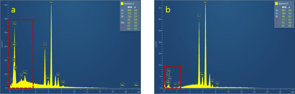 Results of EDS spectrum analysis: (a) austenite microstructure (normal part), (b)