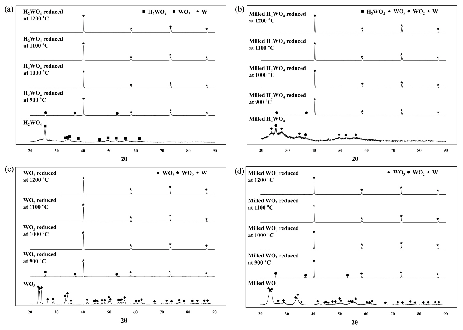 온도에서 텅스텐이 형성되는 것을 알 수 있다. 900 °C에서 열처리된 분말의 경우 일부분 산화물이 WO2 형태로 남아있는 것을 확인할 수 있는데 이를 통해 텅스텐 산 수소 환원은 H2WO4→ WO3→ WO2→ W의 순으로 일어난다는 것을 예상할 수 있다 [20]. 즉, 텅스텐 산으로부터 H2O의 분해로 WO3가 생성되고 이후 수소에 의한 환원이 진행되어 WO3의 WO2로의 변환이 일어나며 WO2 상에서 텅스텐이 형성되는 것이다. 그림 3의 저온 열처리 과정에 의한 텅스텐 산의 상 변화를 통해 텅스텐 산으로부터 H2O가 분해되는 온도는 200~300 °C이며 400~700 °C의 온도에서 WO3가 WO2로 환원되고 900 °C 이상의 온도에서 WO2가 텅스텐으로 완전하게 변화하는 것을 알 수 있다. 그림 2에서 알 수 있듯이 텅스텐 산의 경우 밀링을 통해 일부 H2O의 분해가 발생하여 산화 텅스텐이 생성되는 것을 확인할 수 있는데 이는 실험에서 적용된 고에너지 밀링 과정 중 고온 환경이 유발되었기 때문이다 [21]. 다만 텅스텐 산과 산화 텅스텐에서 동일하게 수소 환원 온도는 밀링 적용 여부에 따른 변화는 없는 것으로 확인되어 텅스텐 산과 산화 텅스텐의 입도가
