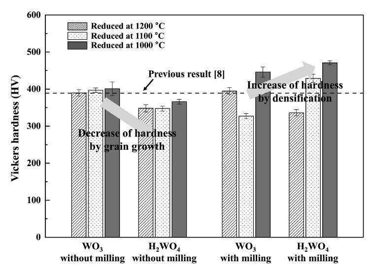 부터 제조된 텅스텐 분말에 비해 높다고 할 수 없지만 소결 후 상대밀도의 경우 밀링 적용 여부, 환원 온도에 상관 없이 텅스텐 산으로부터 합성된 텅스텐