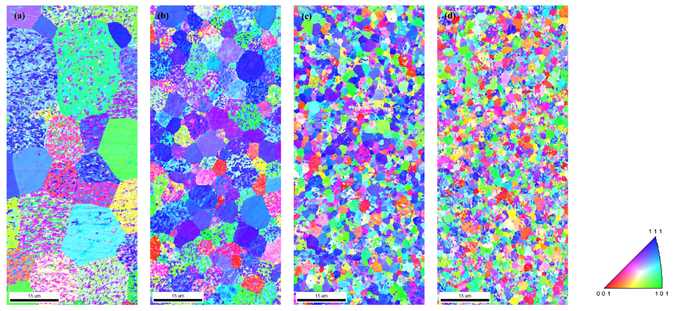 후방 산란 회절법(EBSD, Electron Backscatter Diffraction)을 이용하여 소결체 미세조직 상 텅스텐 입자 크기를 확인하였다.