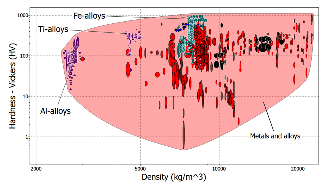윗부분으로 갈수록 목표에 적합한 재료로 볼 수 있다. 그러나 경도와 밀도, 두 조건을 동시에 만족하는 위치의 재료는 뚜렷하게 찾아볼 수는 없다. 철
