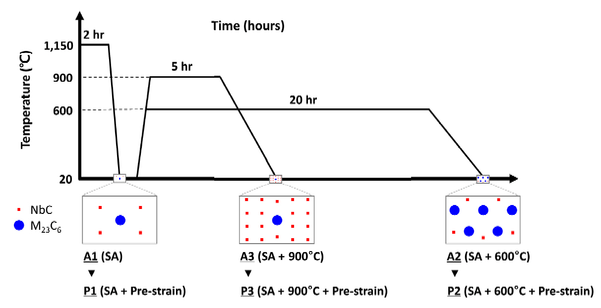 용체화 풀림(SA) 이후 일부 시편들은 M23C6 와 NbC를 형성시키기 위해 그림 1과 같이 600 °C와 900 °C에서 각5 시간과 20시간을 유지하였다. 편의상 용체화 풀림 시편은 A1, 이후 600 °C에서 M23C6 석출물 형성 처리한 시편은 A2, 900 °C에서 NbC 석출물 형성 처리한 시편은 A3로 구분하였다. 그리고 열처리된 시편에 10% 예비변형(Prestrain)을