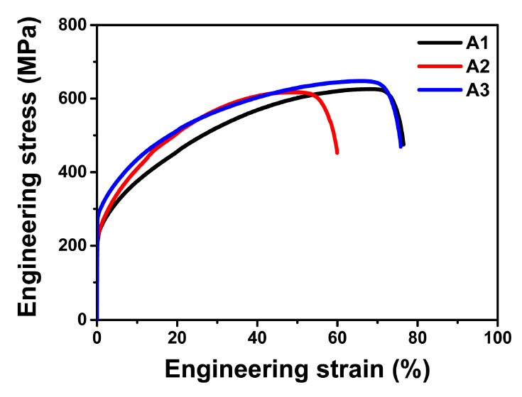 중에서도 입내와 입계에 미세 석출물이 다수 형성된 A3 시편의 연성이 가장 높았고, 입계에 조대 석출물이 다수 형성된 A2 시편의 연성이 가장 낮았다.